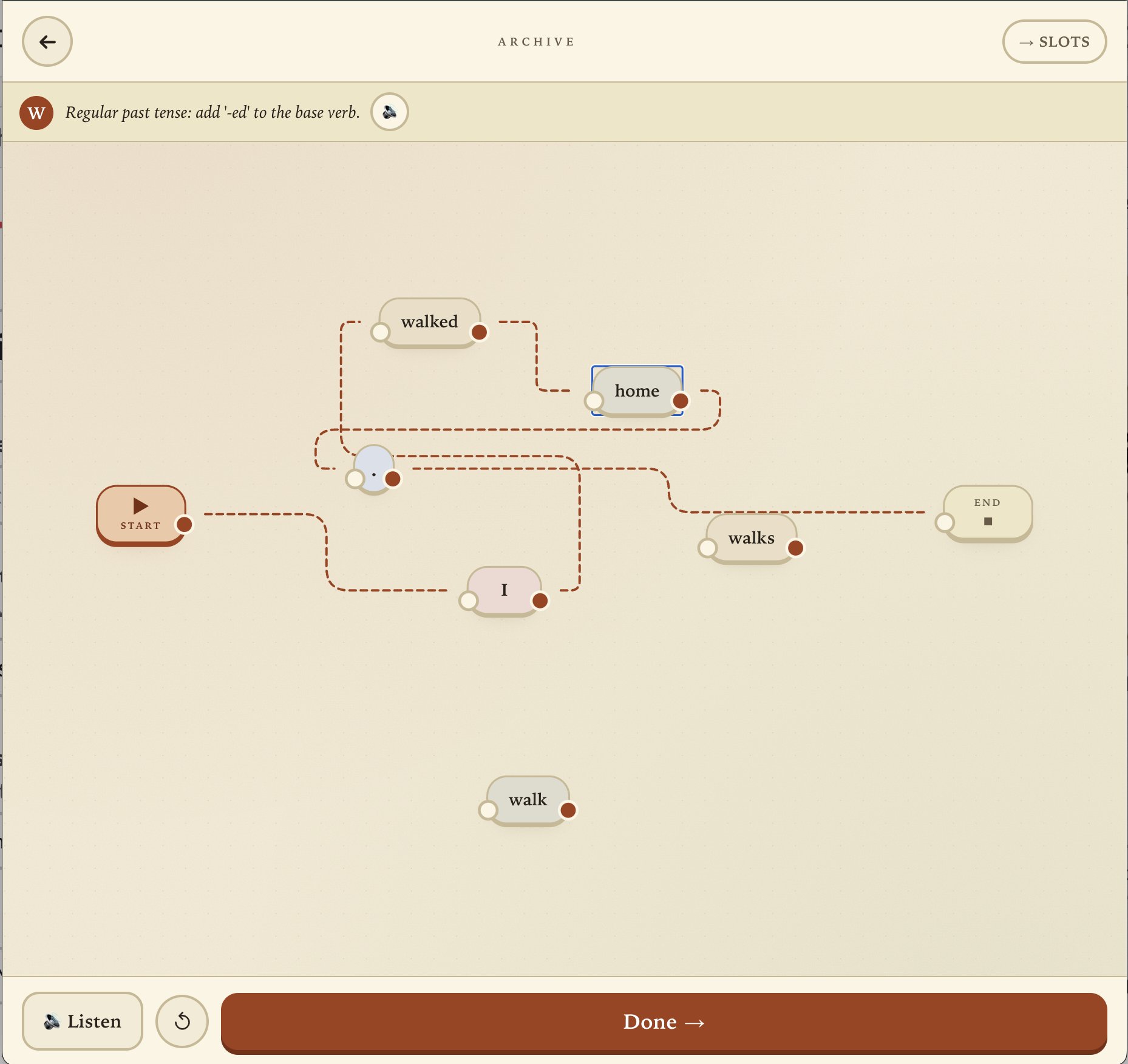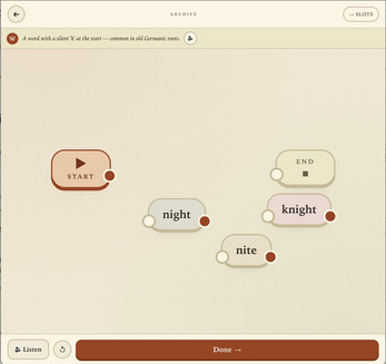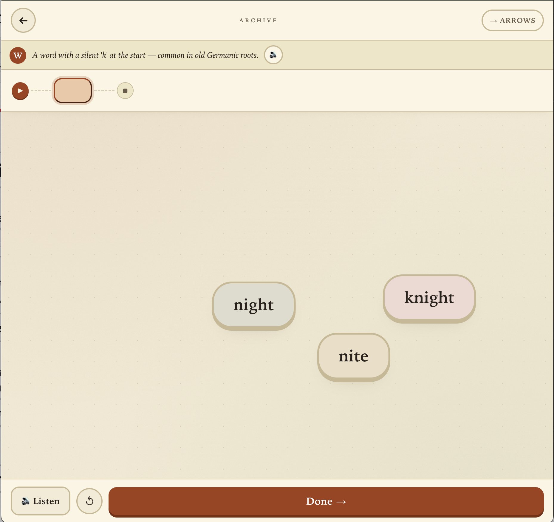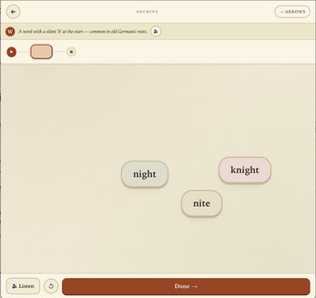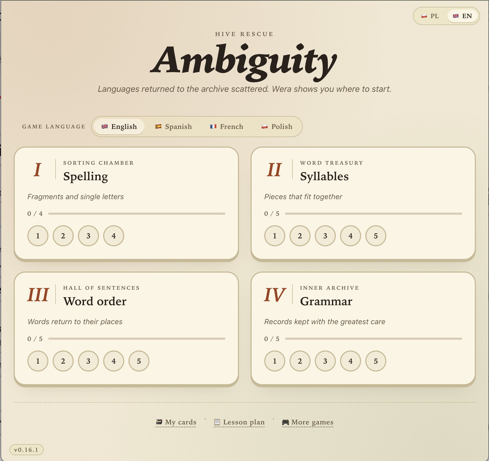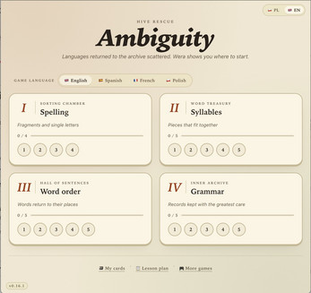 Hive Rescue: Ambiguity is a language puzzle game for early readers (ages 5–10). Each puzzle gives you a set of word, syllable, or letter tiles and one task: connect them in the right order to restore a sentence from the Archive. The target sentence is read aloud, and you build what you hear.