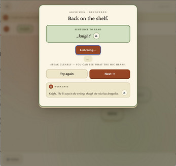 The Archive survived the collapse — but its language records didn't. Tiles, scrolls, and letter-fragments lie scattered across the vaults, mixed together, waiting to be sorted. Wera, the keeper of the Archive, remembers what the sentences said. She just can no longer read them herself.
