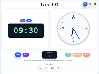 Match the analog clock to the digital time before the countdown ends and earn points based on difficulty. Choose from three visual difficulty levels, from a fully numbered clock face to a minimalist marker-only version.