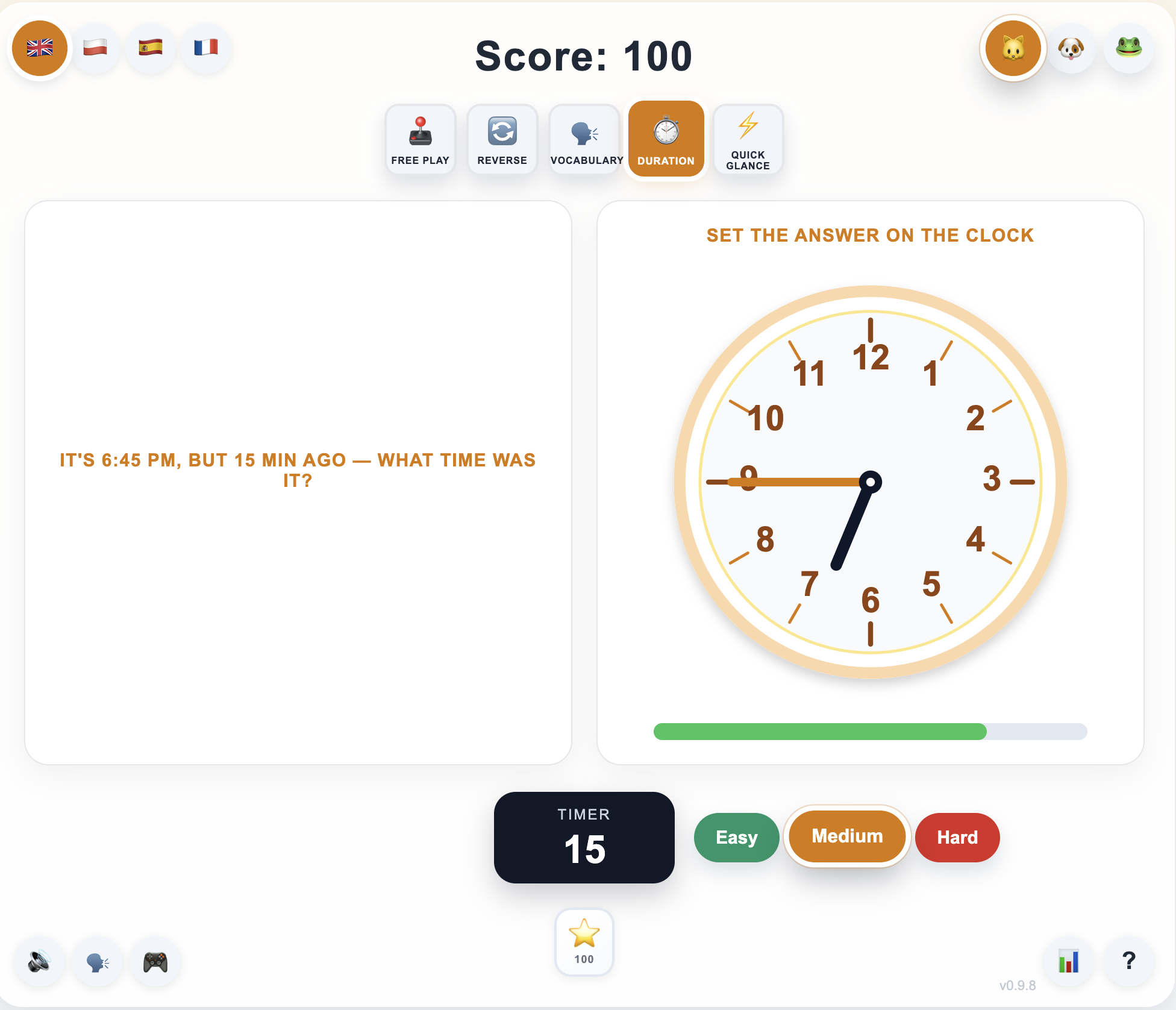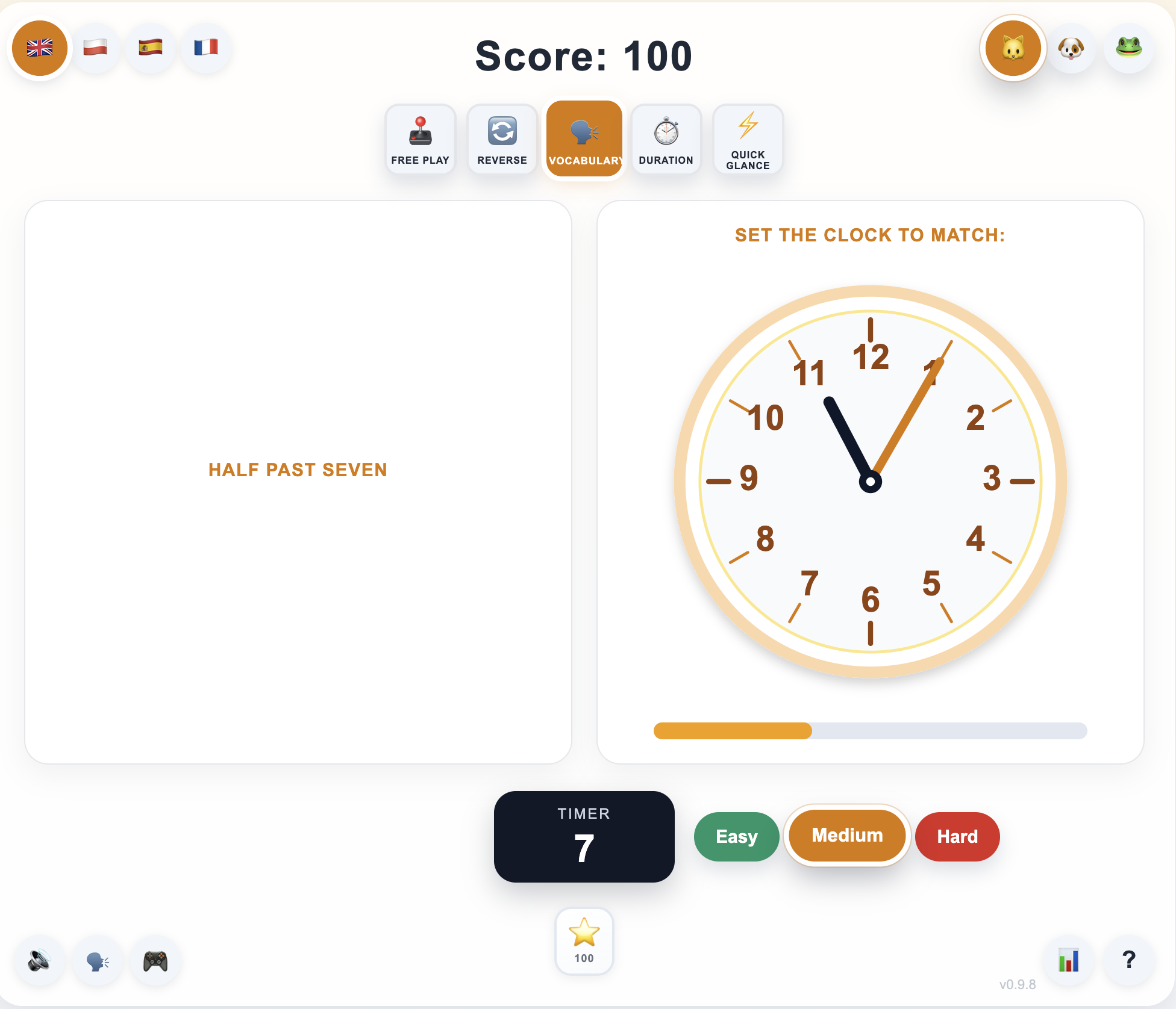 ๐ฃ๏ธ Vocabulary - Hear a phrase like "quarter past seven" or "half past three" and set the clock hands to match.